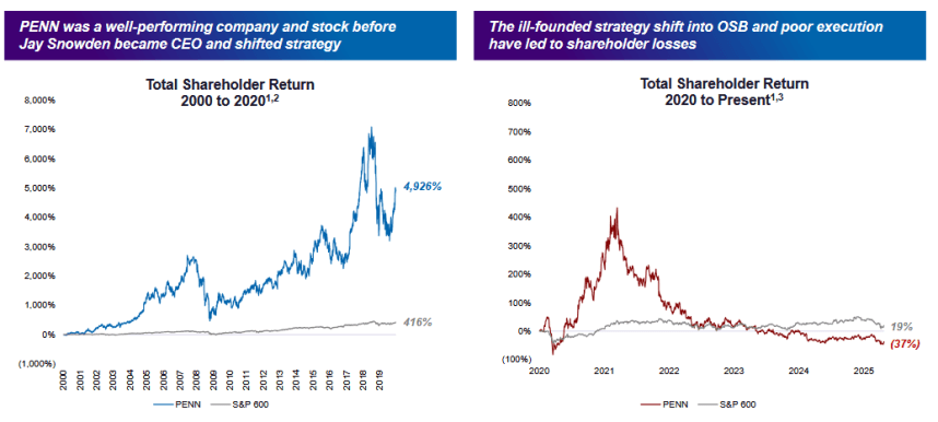 Shareholders have suffered greatly due to poor strategic decisions, failed transactions, and poor execution; absolute and relative total shareholder returns have been abysmal and more than $11 billion of shareholder value has been destroyed since 2021,” according to the hedge fund, which is attempting to place three hand-picked candidates on Penn’s board of directors.