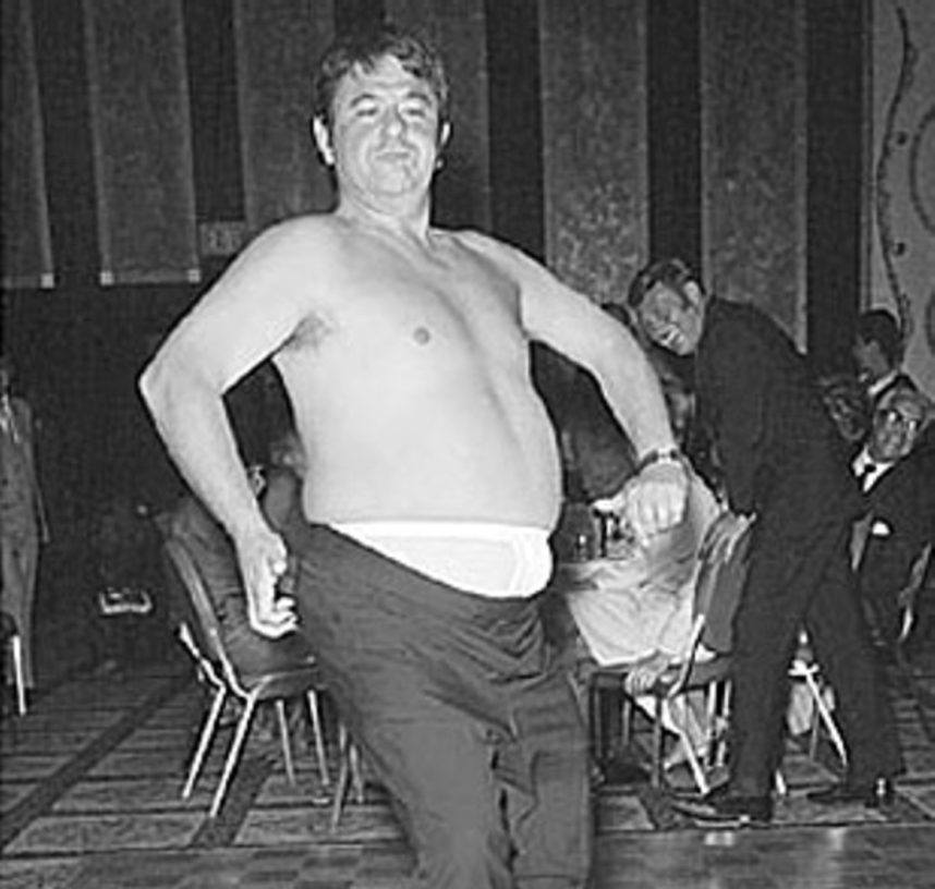 Buddy Hackett strips at a party thrown by Frank Sinatra at the Frontier in 1969. (Image: vegasretro.com)